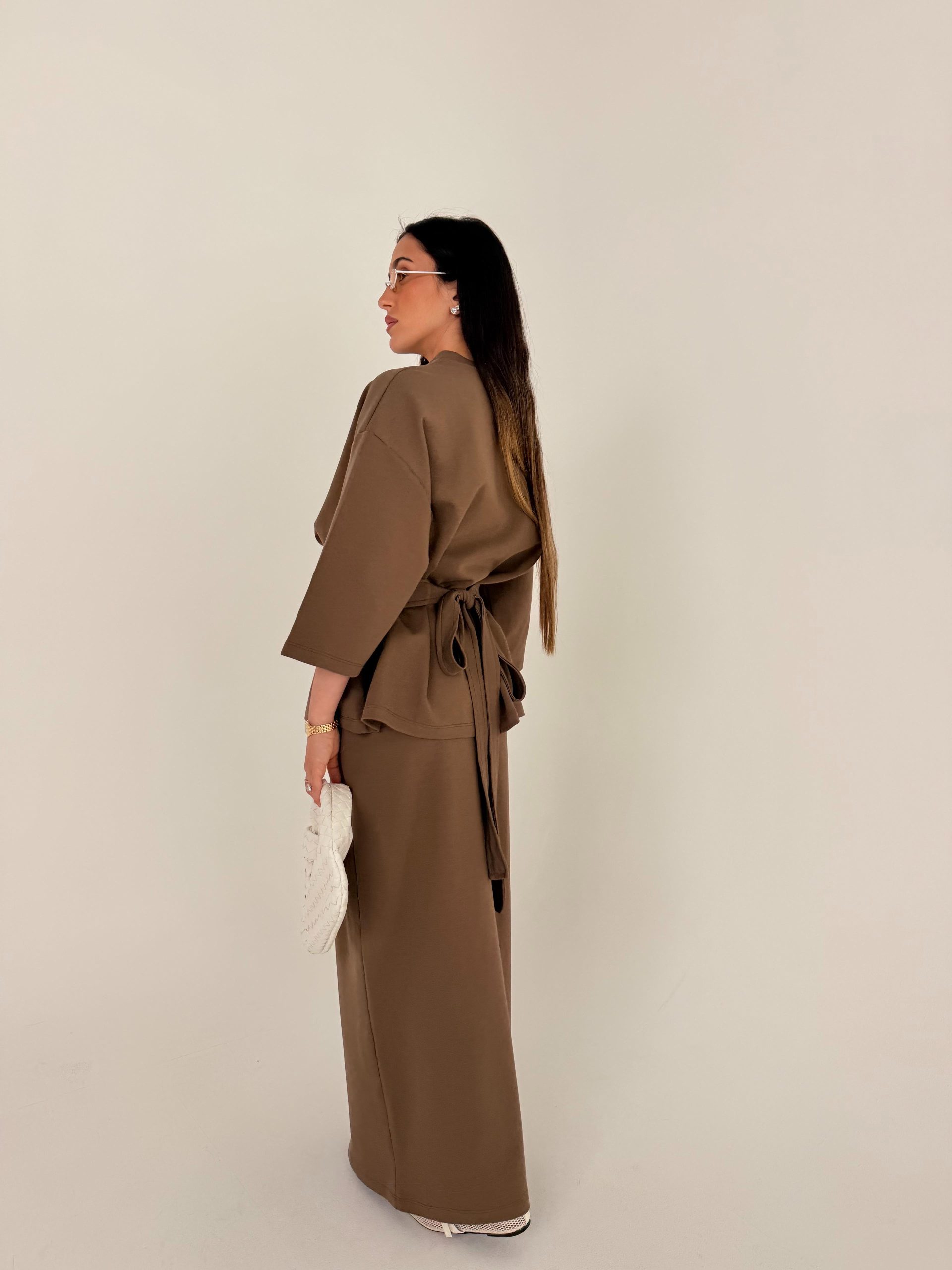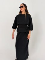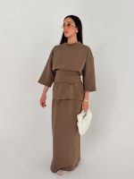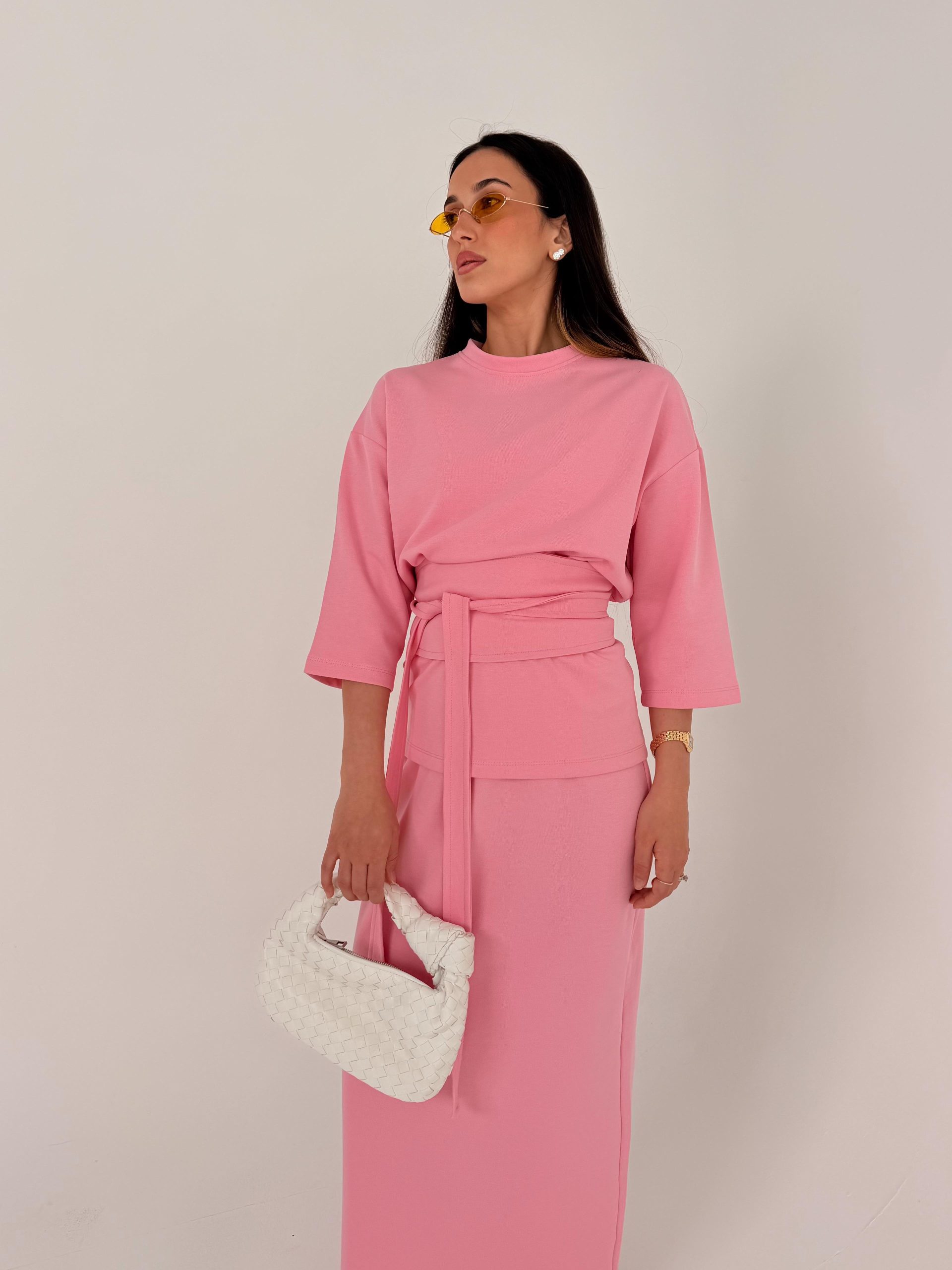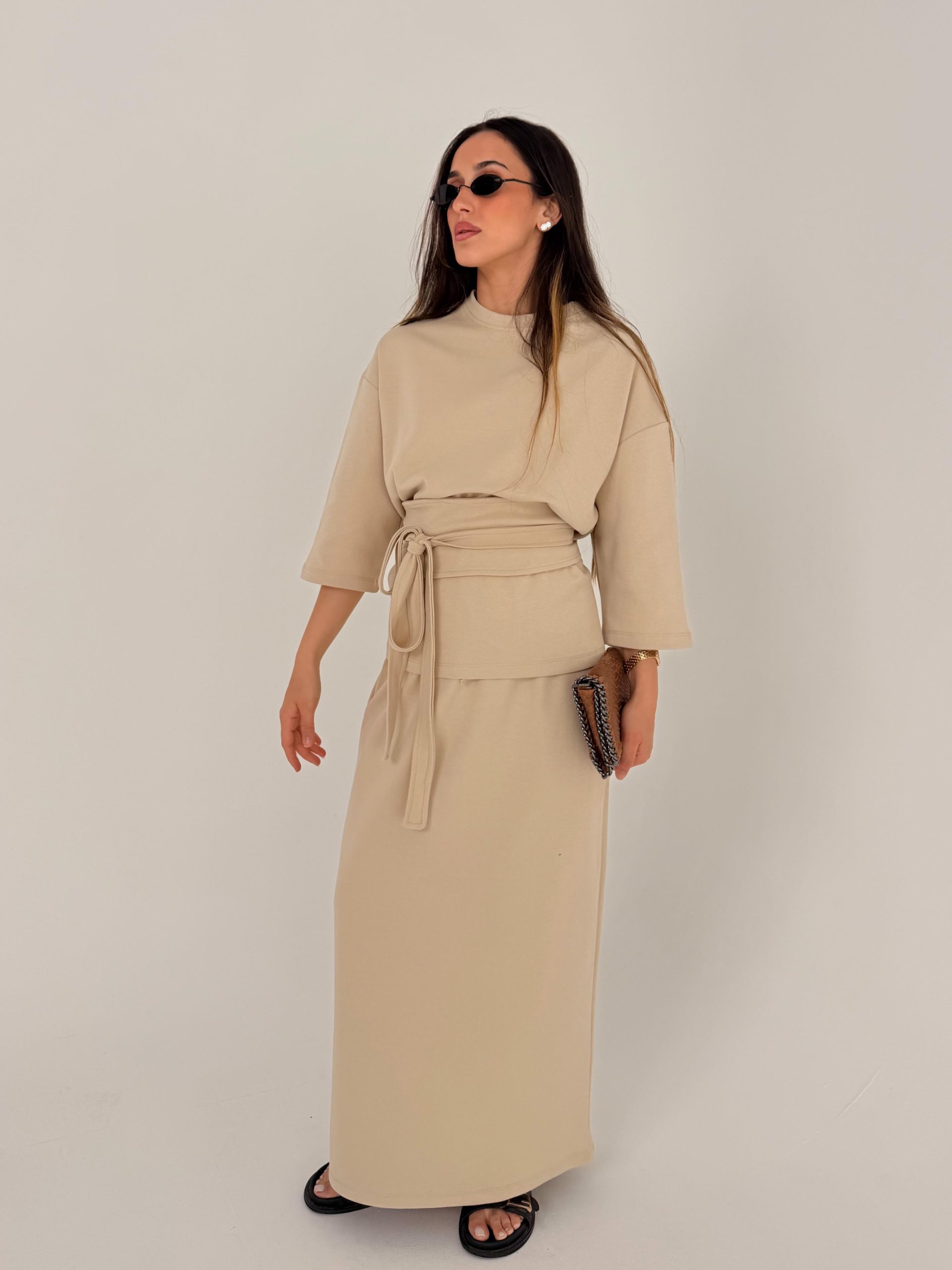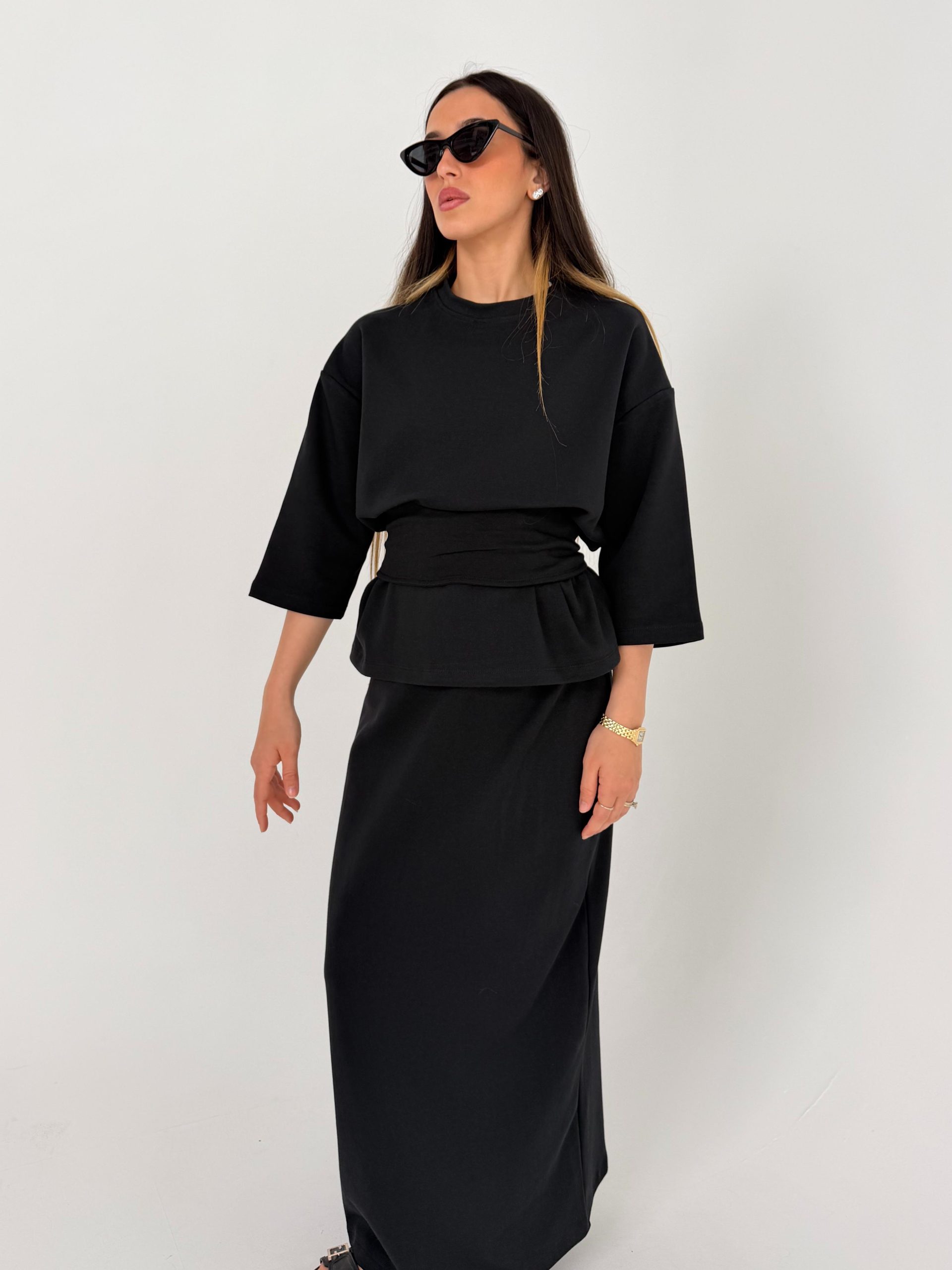 חליפה מהממת הכוללת 3 חלקים: חולצה. חצאית ותוספת בד שיכולה להיקשר במותן כמו שמצולם על הדוגמנית. חולצה אוברסייז רחבה. גומי במותן. בד איכותי במיוחד :)